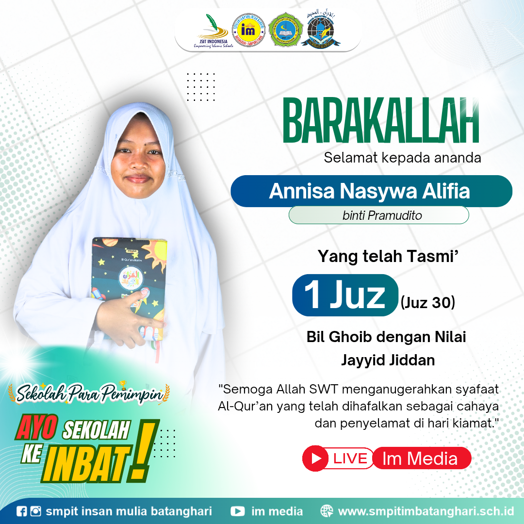 Alhamdulillah, segala puji bagi Allah SWT. Dengan izin-Nya, website SMP IT Insan Mulia Batanghari hadir sebagai sarana informasi dan komunikasi bagi siswa, orang tua, guru, dan masyarakat.
